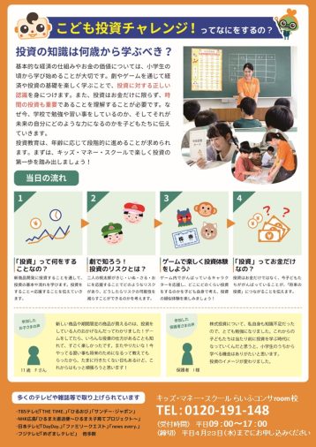 参加費 無料 対象の方 小学校2年生から6年生のお子様とその保護者様 持参するもの 電卓・筆記用具 定員 15組 主催者 キッズマネースクールらいふコンサroom校