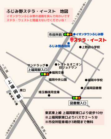 - 埼玉県ふじみ野市福岡1-1-8 *ふじみ野市役所に隣接(駐車場3時間無料)・イオンタウンふじみ野(駐車場無料)の向かい側