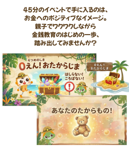 45分のイベントで手に入るのは、お金へのポジティブなイメージ。親子でワクワクしながら金銭教育のはじめの一歩、踏み出してみませんか?